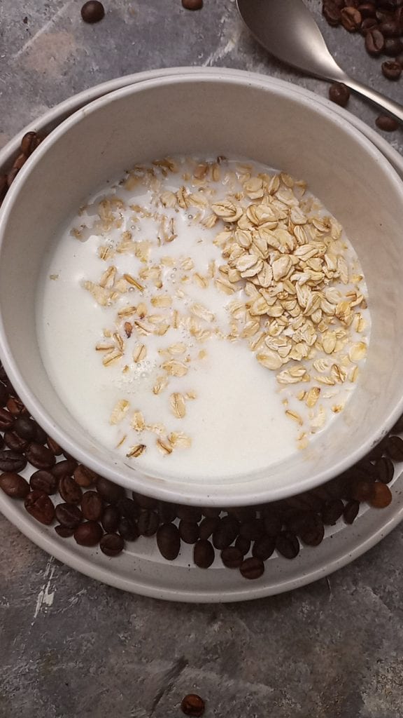 • Pour préparer un Porridge overnight avec yaourt au café frais et délicieux, commencez par verser les flocons d’avoine dans un bol et ajoutez le lait.