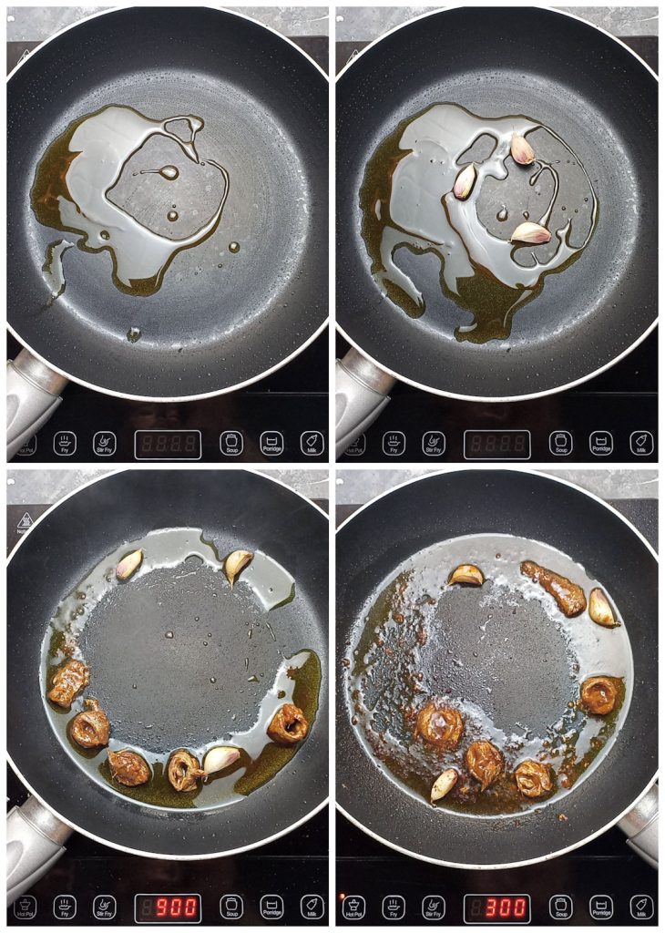 Dans une grande poêle, fais dorer l’ail en chemise dans l’huile.