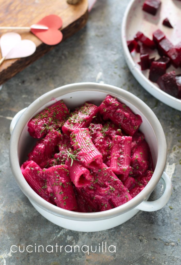 Rigacuori à la betterave rouge et stracchino recette pour la Saint-Valentin, une recette facile et rapide qui se réalise pendant le temps de cuisson des pâtes ! Idéale pour le dîner, cette recette nécessite très peu d’étapes et d’ingrédients. La mienne est sans lactose parce que le stracchino et le beurre sont complètement délactosés, donc elle est idéale aussi pour les intolérants. Et comme chaque Saint-Valentin, depuis quelque temps maintenant, cette année encore nous renouvelons la tradition de mettre sur la table les Rigacuore de la Molisana ! Ici en bas, je vous laisse quelques recettes de plats principaux idéales pour cette occasion tandis qu’en bas, à la fin de la description complète des étapes photographiques, je réponds à quelques questions plus communes.