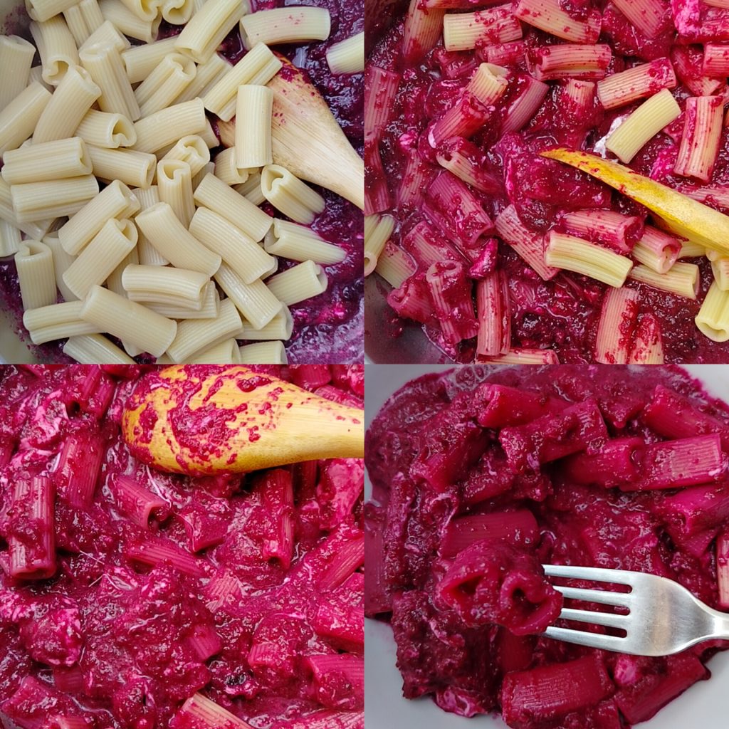 Dans une grande poêle, faites fondre le beurre dans la première louche d’eau chaude et ajoutez le stracchino. Je n’ajoute pas de sel, mais si vous le préférez, vous pouvez en mettre un peu. Lorsque le stracchino sera ramolli, ajoutez la crème de betteraves et mélangez avec la deuxième louche d’eau chaude que vous pouvez également utiliser pour bien nettoyer le verre du mixeur, comme je l’ai fait.