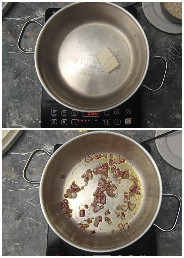 Dans une grande casserole, faites fondre le beurre et ajoutez l’oignon en le cuisinant à feu doux pendant 5 minutes, jusqu’à ce qu’il devienne transparent. Il deviendra ainsi plus digeste.