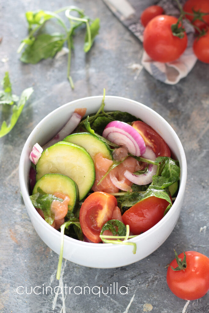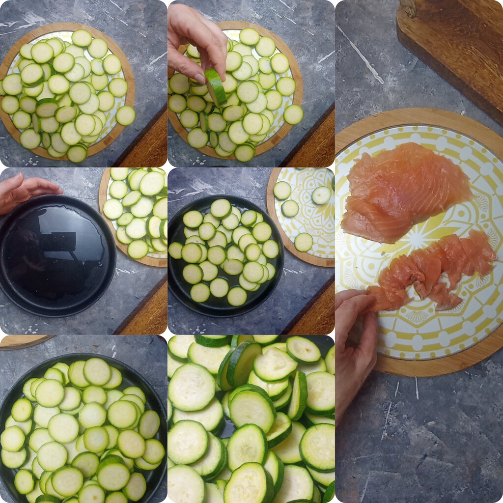 Salade de courgettes et saumon cuites au micro-ondes, une recette facile et rapide à réaliser, avec très peu d’étapes.