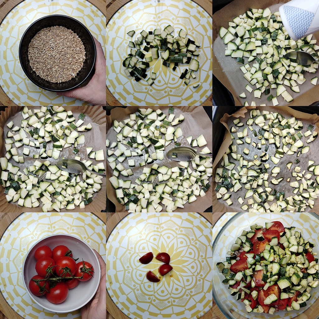 Ajoutez les courgettes et les tomates cerises à l’épeautre, ajustez le sel si nécessaire, ajoutez une cuillère à soupe d’huile et mélangez.