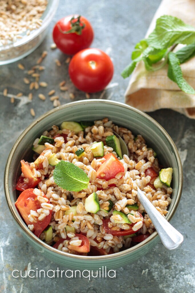 Dans sa simplicité, c’est un plat spectaculaire et délicieux, Salade d’épeautre avec courgettes et tomates cerises, une recette facile et gourmande que vous pouvez également enrichir à votre guise.
