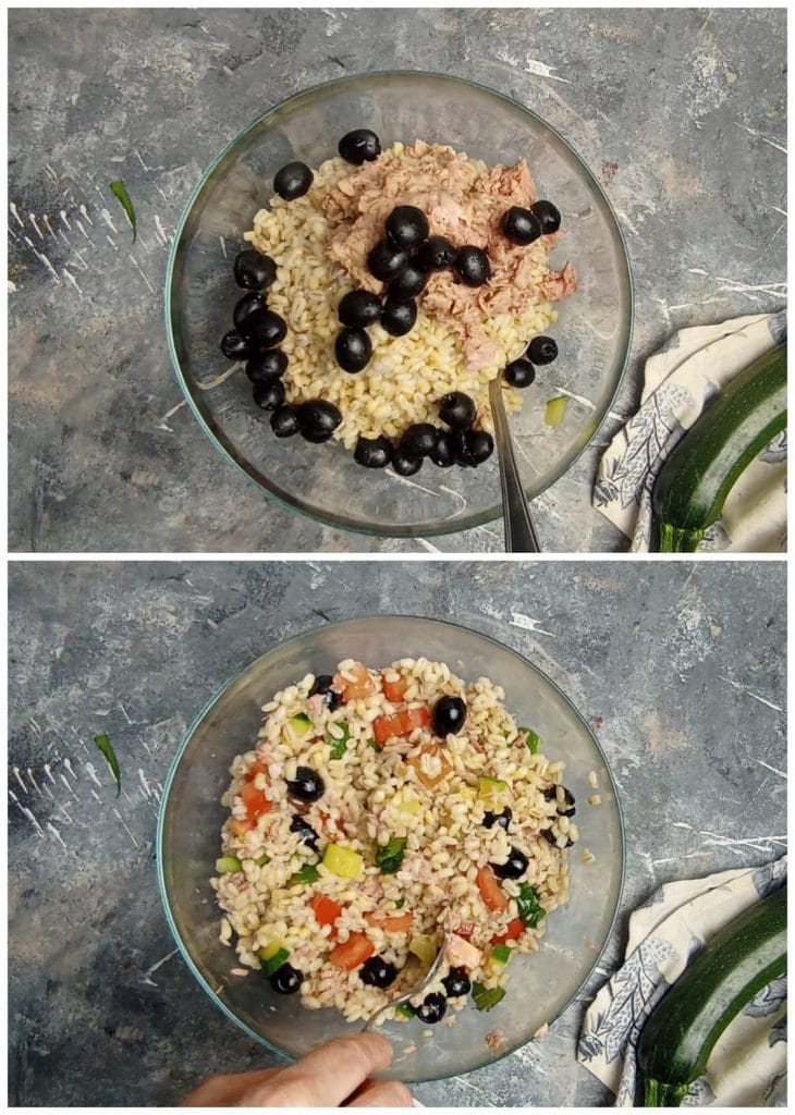 Ajoutez-la au bol avec l’orge et les courgettes, salez légèrement et ajoutez le thon avec son huile de conservation.