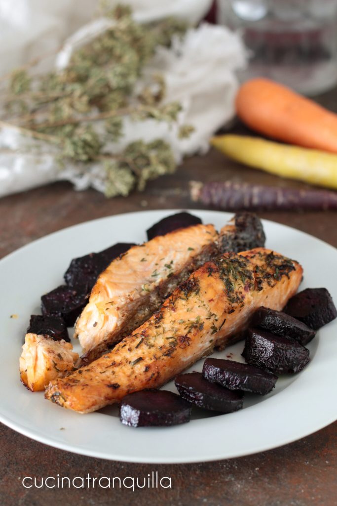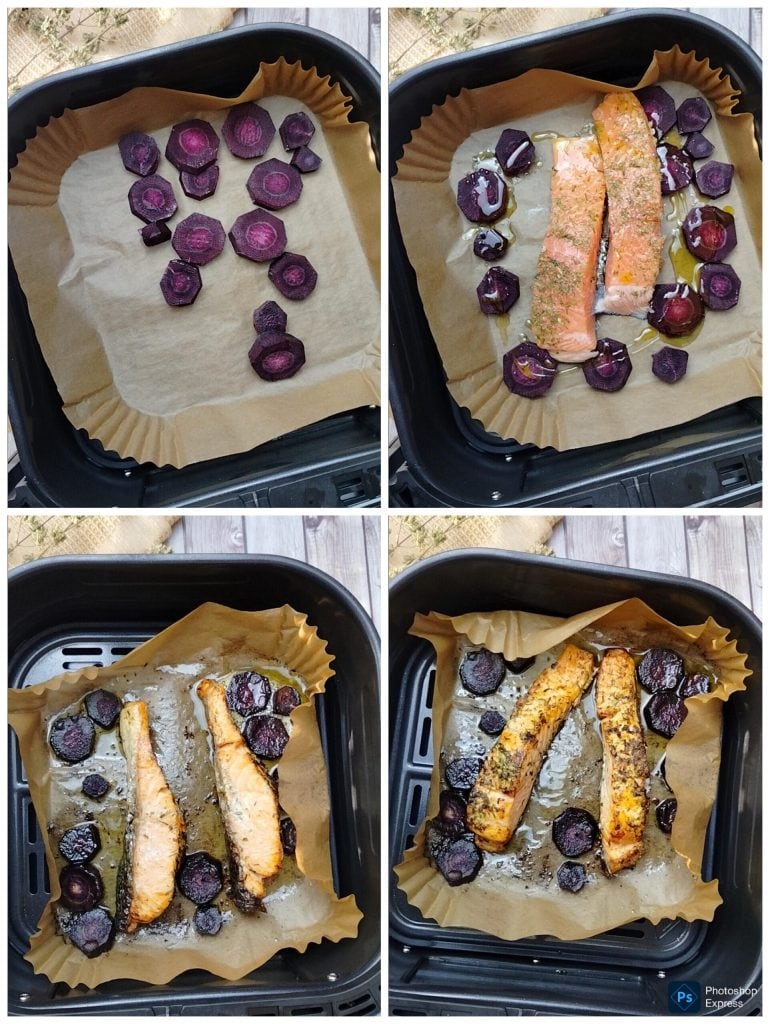 Saumon mariné cuit à la friteuse à air avec des carottes violettes, une recette très rapide et simple à faire.