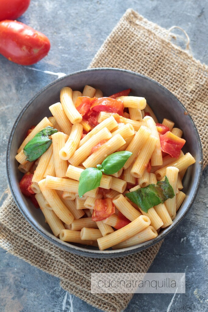 Sedani rigati aux anchois et tomates San Marzano, une recette à préparer en très peu de temps.