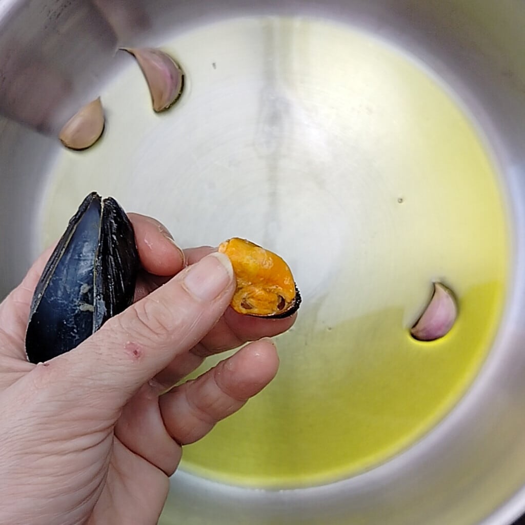 Dans une grande casserole, faites revenir la moitié de l’ail dans l’huile. Vous pouvez choisir de l’utiliser en chemise, haché ou entier. Ajoutez les moules et couvrez avec un couvercle. À feu doux, faites ouvrir les moules qui libéreront leur jus de cuisson. Cela prendra environ 10-15 minutes.
