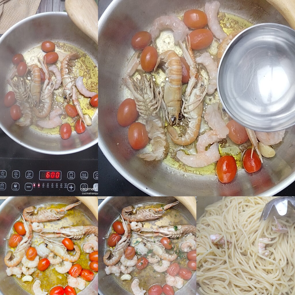 • Pour préparer les Spaghetti aux langoustines et tomates cerises, commencez par bien nettoyer les langoustines. Séparez les têtes des corps et mettez-les de côté, incisez la partie de la carapace et ouvrez-la délicatement. Gardez également quelques langoustines entières de côté.