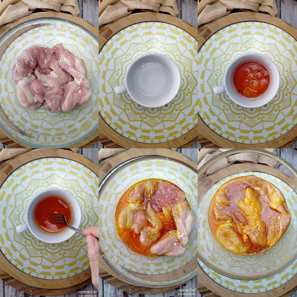 • Pour faire le Steak de poulet au safran à la friteuse à air, placez le poulet dans un grand bol. Dans une tasse d’eau tiède, dissolvez le safran et ajoutez-le à l’huile d’olive extra vierge, au sel fin et à l’ail en poudre, en mélangeant jusqu’à obtenir une couleur homogène. Trempez les cuisses de poulet dans le liquide et faites mariner la viande pendant au moins 30 minutes au réfrigérateur, en couvrant le bol.