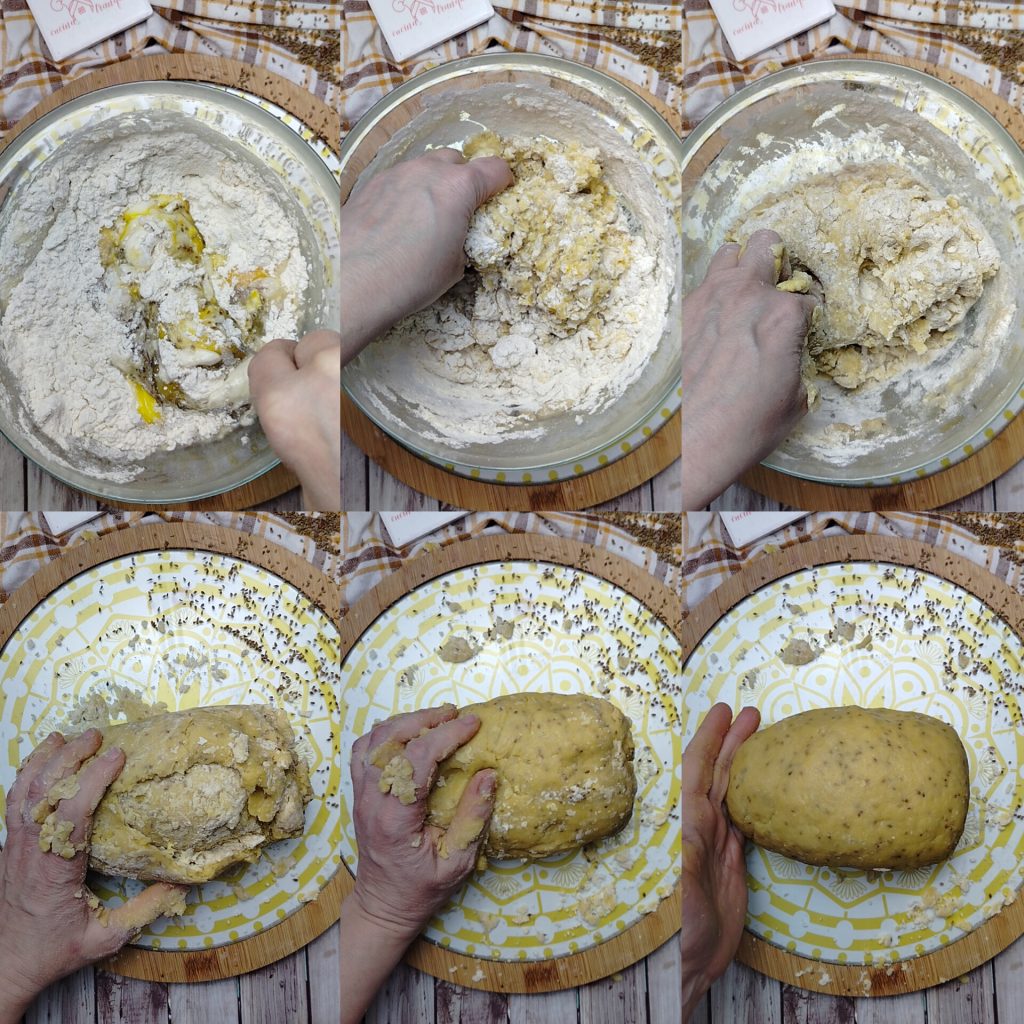 • Pétrissez d’abord avec une fourchette puis à la main, si vous le souhaitez, tout dans le bol ou en passant la pâte sur la planche à pâtisserie. Vous devez obtenir une pâte lisse et homogène.