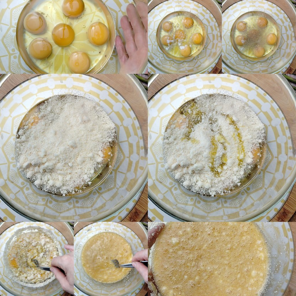 Entre-temps, dans un autre bol, travaillez les œufs avec le sel, le poivre, la moitié du fromage râpé et un filet d’huile d’olive extra vierge.