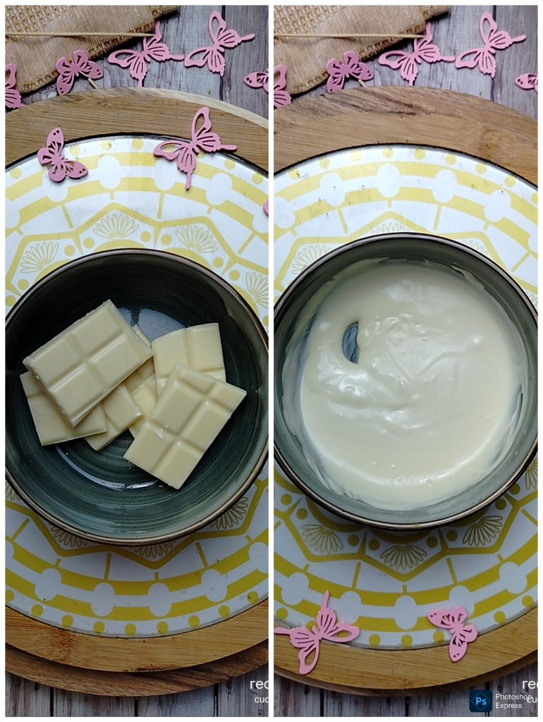 Ajoutez le chocolat blanc fondu, mélangez bien et laissez reposer 30 minutes au réfrigérateur après avoir couvert le bol de film alimentaire.
