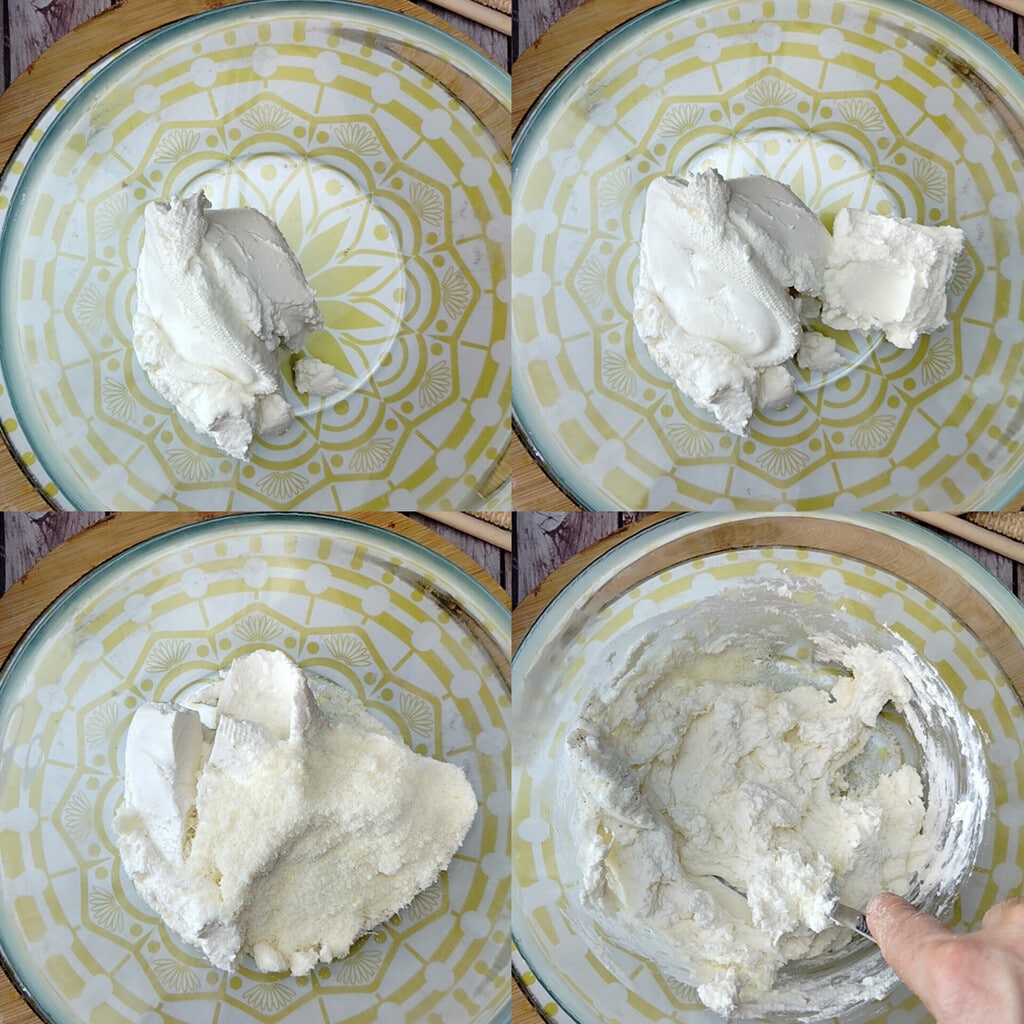 Par un fromage à tartiner crémeux de type Philadelphia. Si la consistance est trop crémeuse et non travaillable, ajoutez peu à peu du fromage râpé, jusqu’à obtenir une pâte travaillable