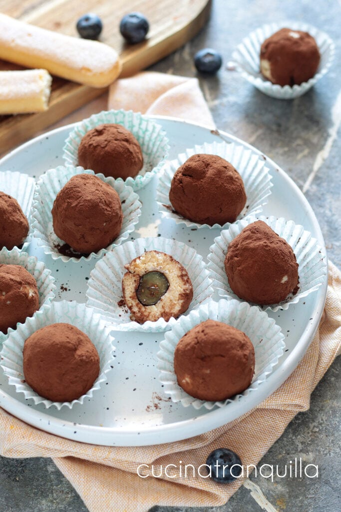Truffes sans cuisson avec ricotta et boudoirs avec un cœur de myrtilles vraiment frais et gourmand.
