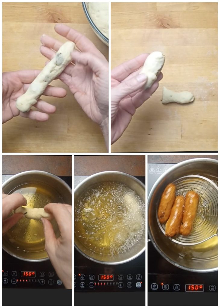 Je prends toujours un morceau à la fois, je lui donne une forme allongée et je le plonge dans l’huile.