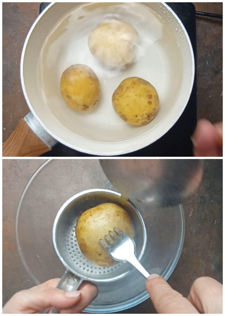 Vérifiez la cuisson avec les dents d’une fourchette, si elles s’enfoncent bien, la pomme de terre est prête.