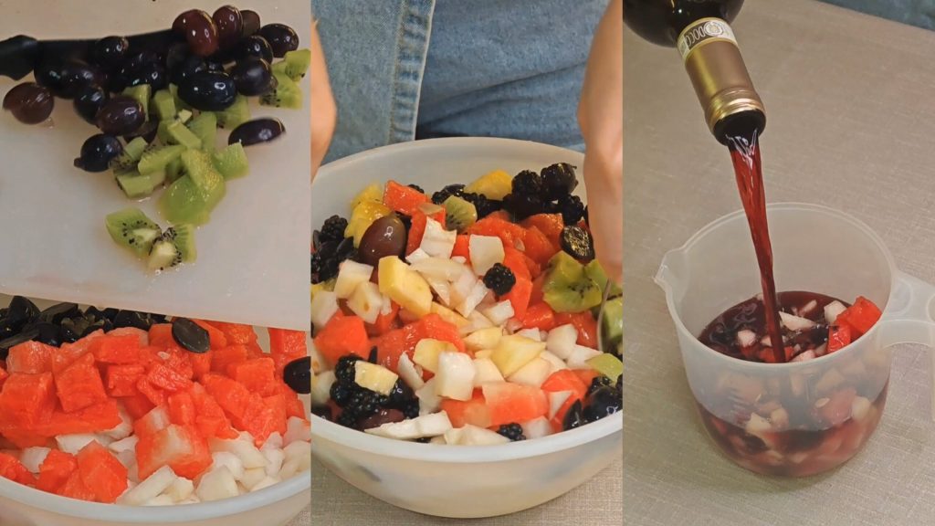 Préparez les fruits, nettoyez et coupez en morceaux les fruits de votre choix. Mélangez-les et mettez-les dans un récipient. Ajoutez le vin, le sirop (eau et sucre),