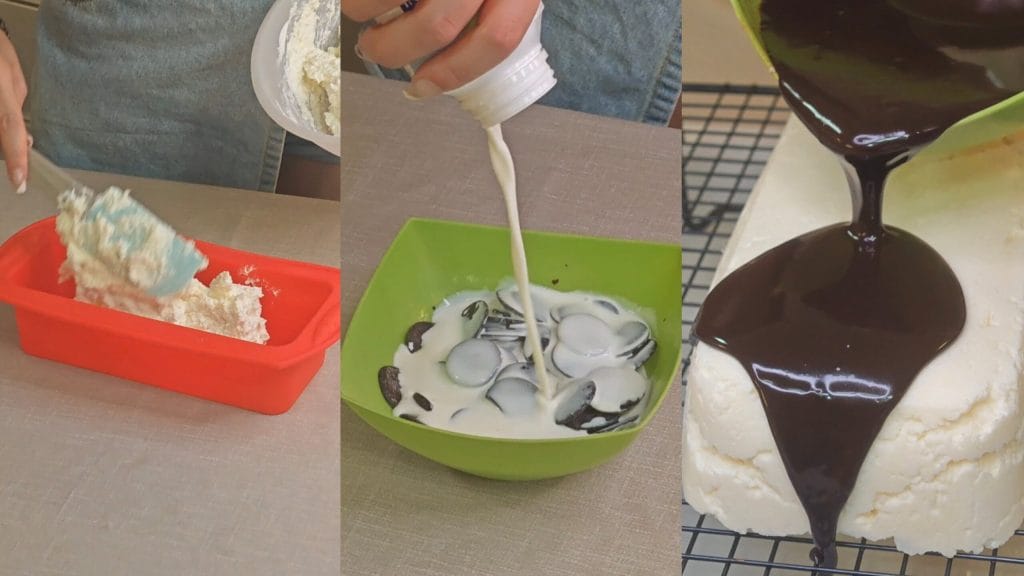 • Verse dans un moule recouvert de film alimentaire, égalise et mets au congélateur pendant au moins 4 heures (mieux toute la nuit). Prépare la ganache : Chauffe la crème et verse-la sur le chocolat noir haché. Mélange jusqu’à obtenir une ganache lisse. Verse sur le semifreddo désormais raffermi et remets au congélateur pendant 30 minutes.
