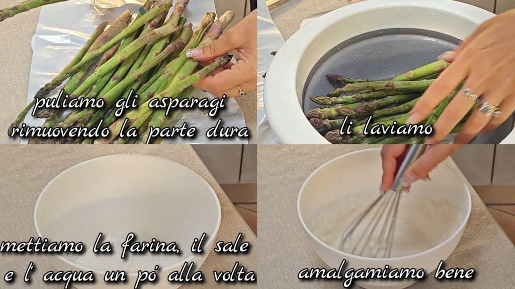 Tout d’abord, nettoyons les asperges en retirant la partie dure de la racine. Nous les lavons et les égouttons bien. Dans un récipient, mettons la farine, le sel et l’eau petit à petit, en mélangeant pour éviter la formation de grumeaux. Nous mélangeons bien