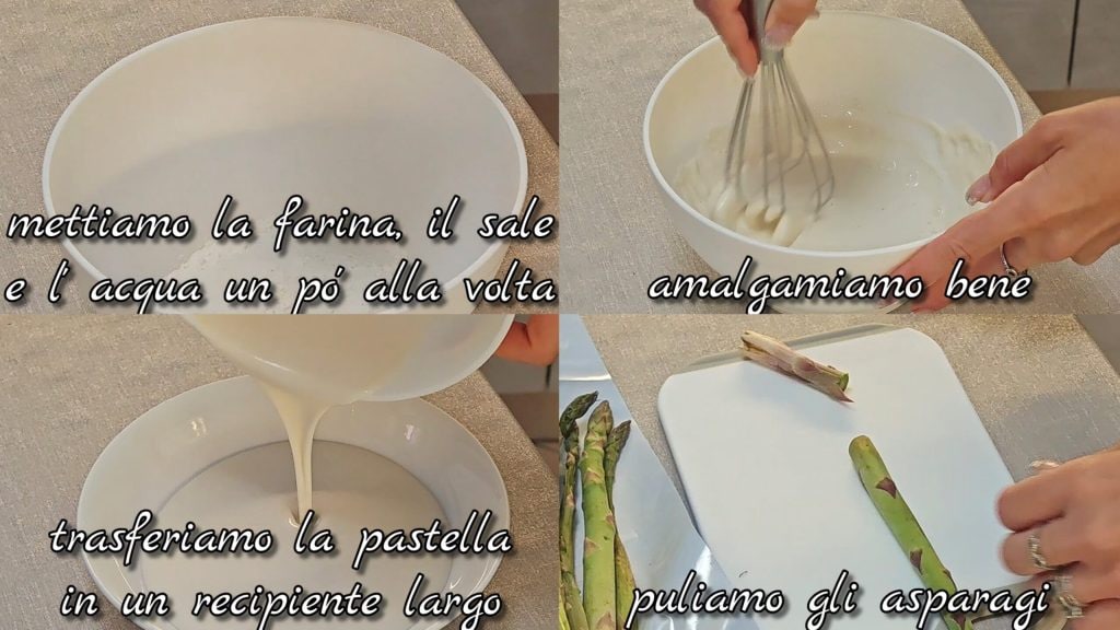 Dans un récipient, mettons la farine, le sel et l’eau petit à petit en mélangeant pour éviter la formation de grumeaux. Nous la transférons dans un récipient large. Pendant ce temps, nous nous occupons de nettoyer les asperges en retirant la partie dure de la racine