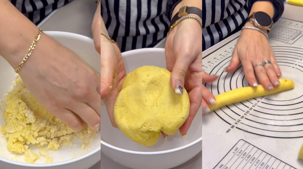 Formez une pâte, enveloppez-la dans du film plastique et mettez-la au réfrigérateur pendant environ 30 minutes. Après le repos, reprenez la pâte et divisez-la en plusieurs parties. Formez des boudins, puis coupez-les en morceaux de la taille désirée.