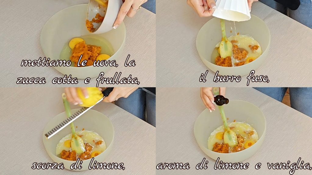 Dans un récipient, mettez les œufs, la citrouille cuite et mixée, le beurre fondu, le zeste de citron râpé, l’arôme de citron et la vanille.