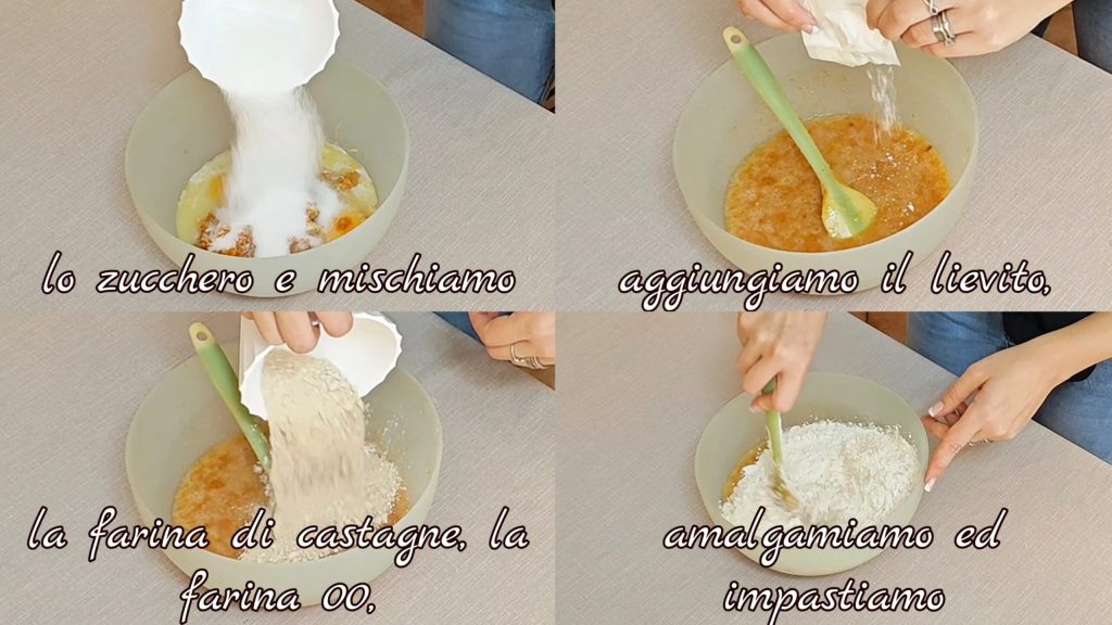 Ajoutez le sucre et mélangez. Ajoutez la levure, la farine de châtaigne, la farine 00 et mélangez et pétrissez rapidement avec les mains.