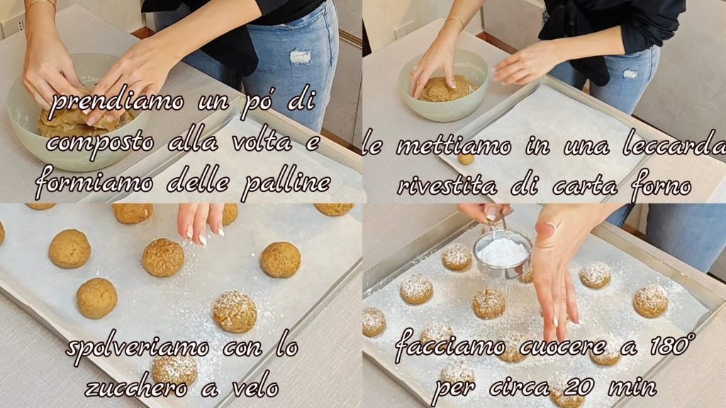 Prenez un peu de pâte avec les mains et formez des boulettes. Disposez-les sur une plaque recouverte de papier cuisson en laissant un peu d’espace entre elles. À la fin, saupoudrez toutes les boulettes de sucre glace puis faites cuire à 180° pendant environ 20 min.