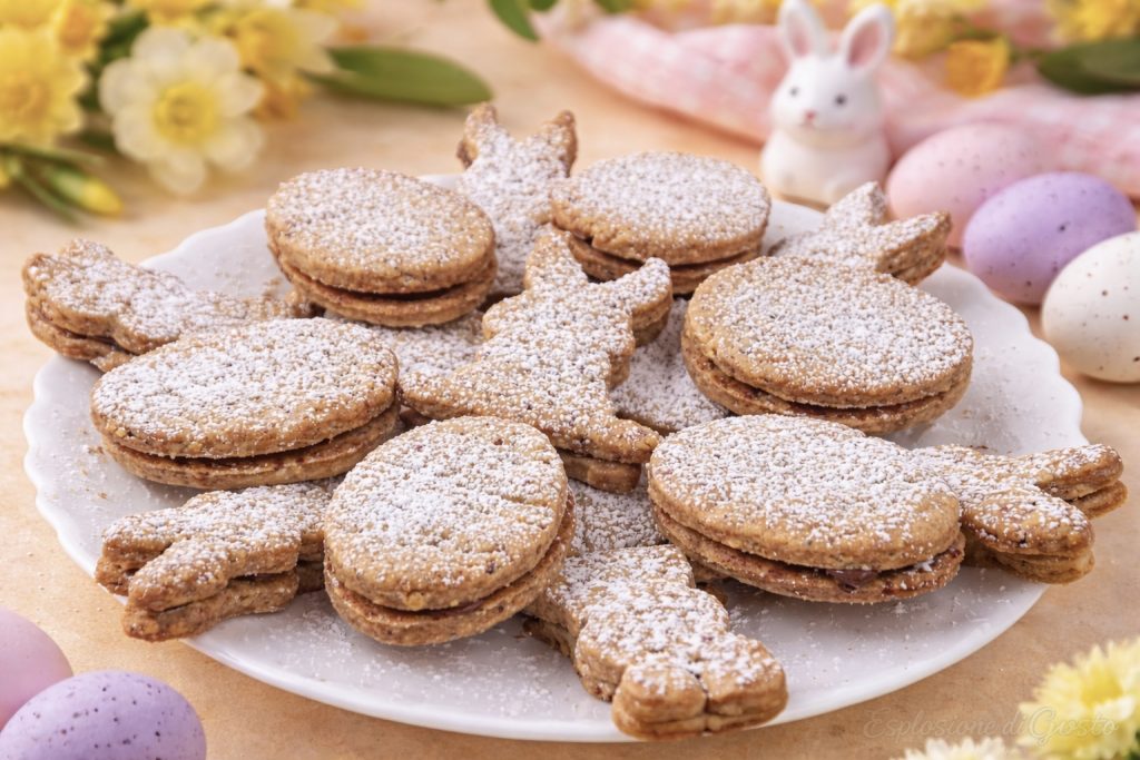 Avec l’aide d’emporte-pièces, on peut créer des formes de lapins et d’œufs de Pâques, rendant ces biscuits non seulement délicieux mais aussi très présentables. Une fois cuits, ils se garnissent de pâte à tartiner aux noisettes, de confiture ou d’autres crèmes, formant des biscuits fourrés parfaits pour le goûter ou pour agrémenter la table des fêtes.
