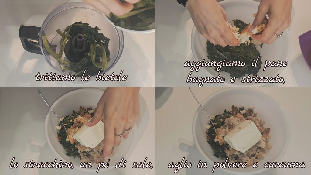 Tout d’abord, nous devons nettoyer et cuire les bettes puis peser 500 g et les hacher avec le mixeur. Nous les transférons dans un récipient et ajoutons le pain mouillé et bien essoré, le stracchino, un peu de sel, de l’ail en poudre et du curcuma.