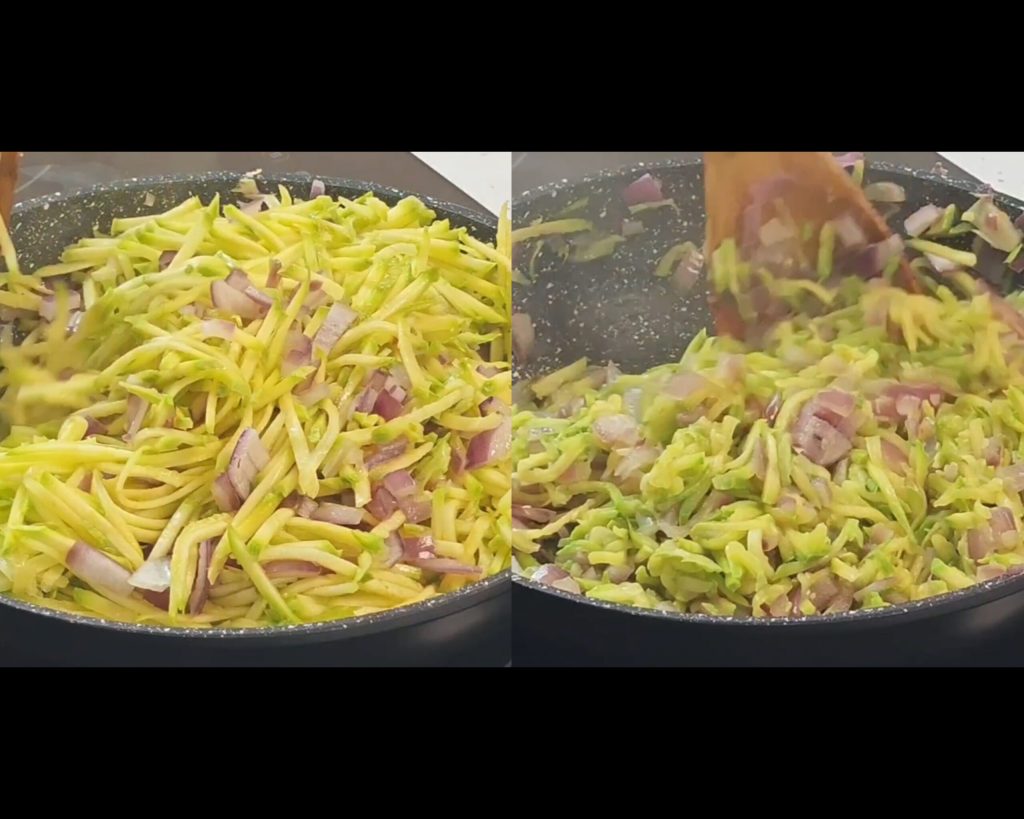 • Ajoutez les courgettes râpées, assaisonnez de sel et de poivre et laissez cuire pendant 5-6 minutes, jusqu’à ce que l’eau soit évaporée. Laissez refroidir.