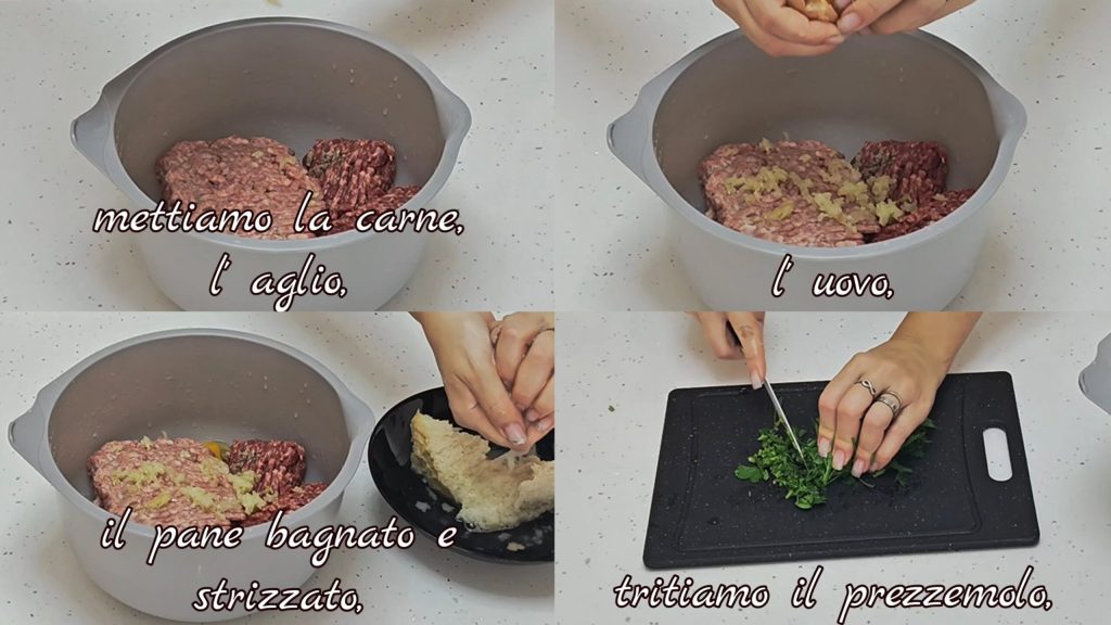 Dans un récipient, mettez la viande, l’ail, l’œuf, le pain mouillé et essoré, le persil haché