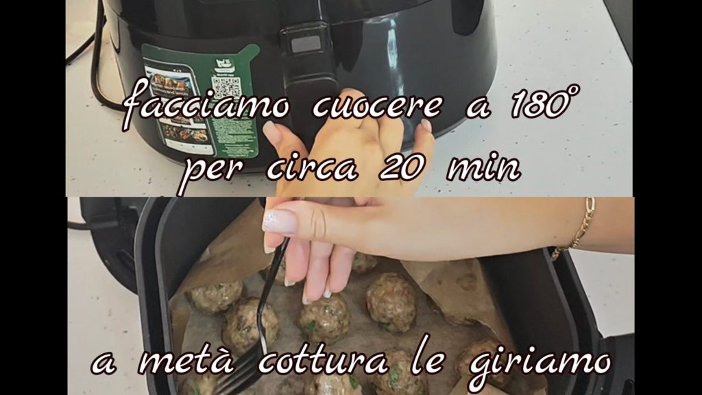 mélangez bien jusqu’à obtenir un mélange homogène. Ajoutez un peu de sel et formez les boulettes en prenant un peu de mélange à la fois et en modelant avec les mains pour former des boulettes de la taille désirée. Placez les boulettes obtenues dans le panier de la friteuse à air.