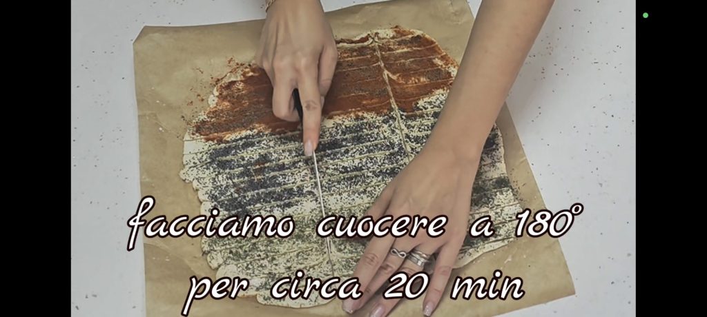 faisons cuire à 180° pendant environ 20 min. Étendons l’autre moitié de la pâte et procédons de la même manière en utilisant des épices à volonté. Coupons en bandes.
