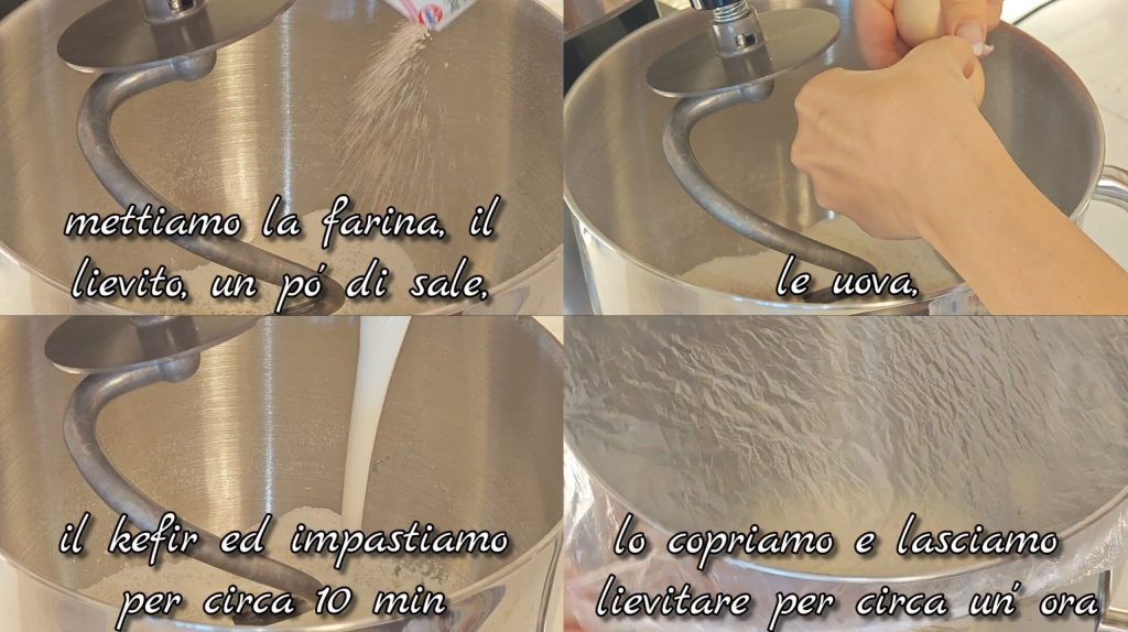 Dans un bol, mettons la farine, la levure, le sel, les œufs et le kéfir. Pétrir environ 10 minutes jusqu’à obtenir une pâte lisse et élastique. Couvrir et laisser lever environ 1 heure, jusqu’à ce que cela double de volume.