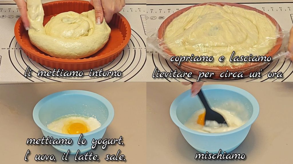 disposons les rouleaux autour pour former une grande spirale. Couvrons et laissons lever encore environ 1 heure. Mélangeons yaourt, œuf, lait et sel.
