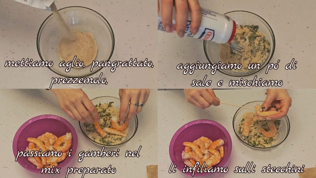 Dans un récipient, nous mettons l’ail, la chapelure, le persil, le sel et mélangeons. Nous passons les crevettes décortiquées dans le mélange préparé puis les enfilons sur les brochettes en bois.