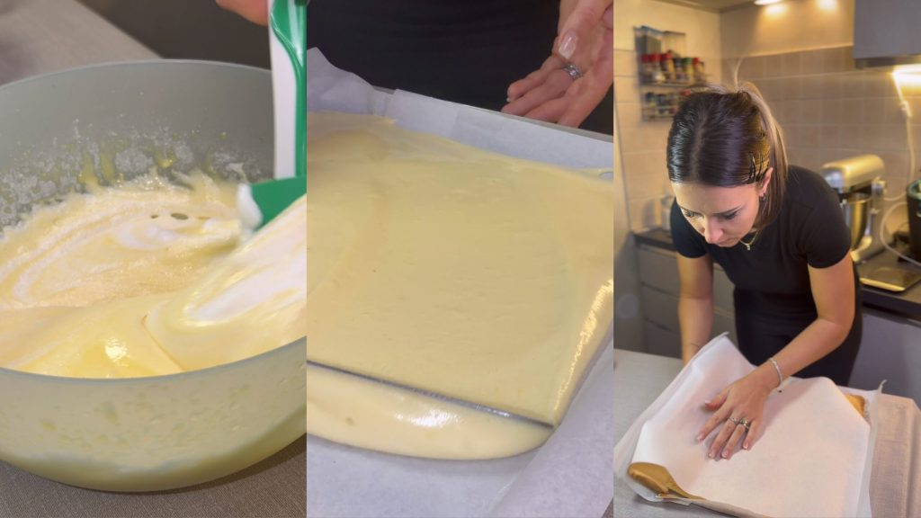 Versez la pâte sur une plaque (35×35 cm) recouverte de papier sulfurisé, égalisez la surface et faites cuire dans un four statique préchauffé à 180°C pendant environ 20 minutes, jusqu’à légère coloration.