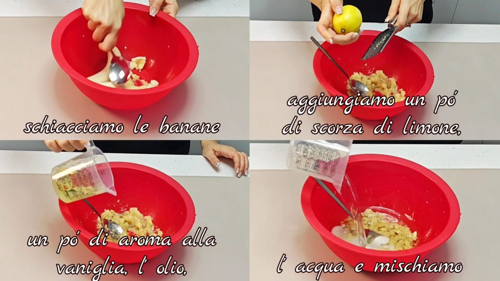 Écrasez les bananes avec une fourchette. Ajoutez un peu de zeste de citron, l’arôme de vanille, l’huile, l’eau et mélangez.
