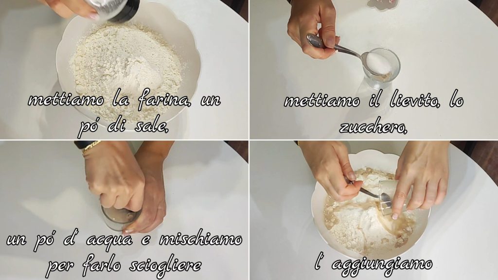 Mettons la farine, un peu de sel. Ajoutons la levure, le sucre et un peu d’eau et mélangeons bien pour le dissoudre. Nous l’ajoutons.