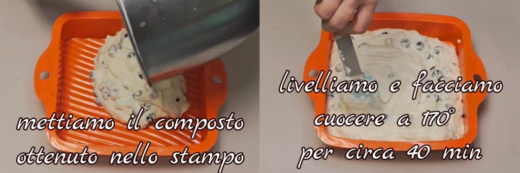 Mettons le mélange obtenu dans un moule au choix (vous pouvez également choisir un moule rond de 20/22 cm et faire un gâteau au lieu de carrés). Niveler et mettre au four à 180° pendant environ 40 min.