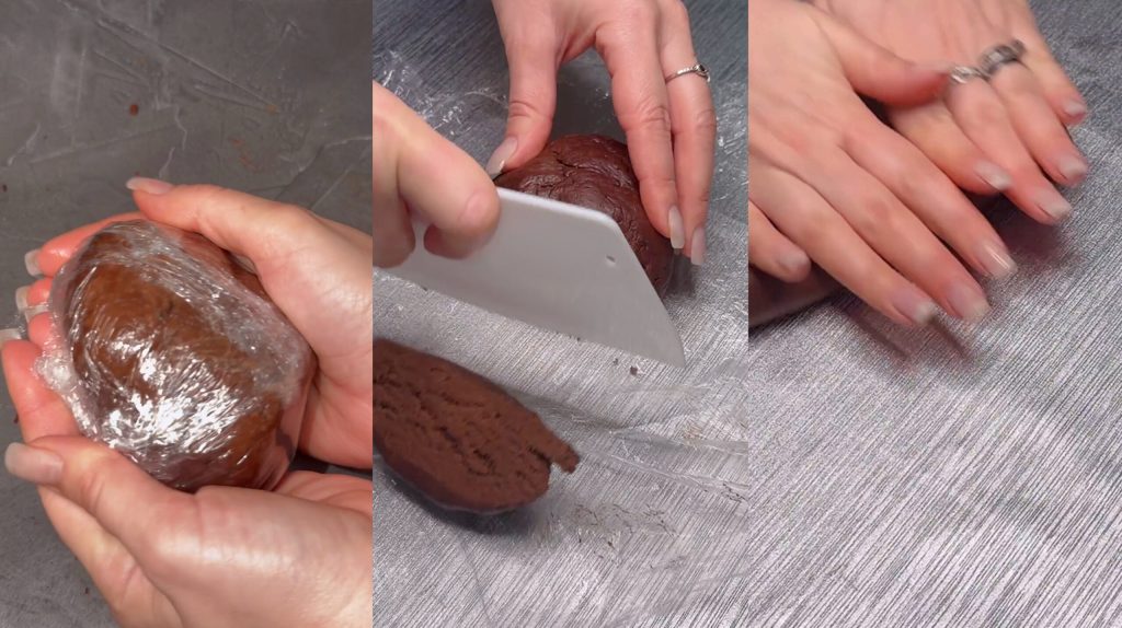 Enveloppons la pâte dans du film alimentaire et laissons-la reposer au réfrigérateur pendant environ 30 minutes. Après le repos, reprenons la pâte et la divisons en plusieurs parties. Formons des boudins,