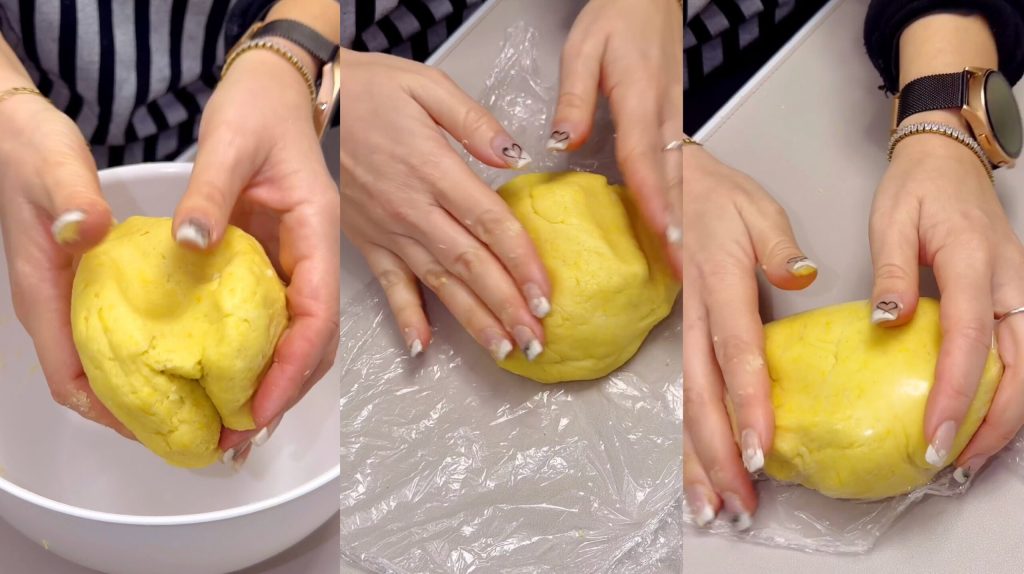 Formez une boule, enveloppez-la dans du film plastique et placez-la au réfrigérateur pendant environ 30 minutes. Après le repos, reprenez la pâte