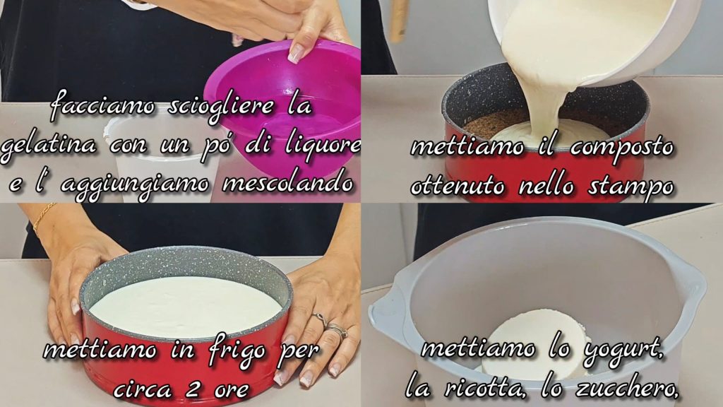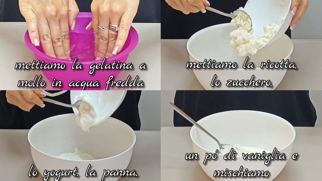 Tout d’abord, faites tremper la gélatine dans de l’eau froide. Dans un récipient, mettez la ricotta, le sucre, le yaourt, la crème, un peu de vanille et mélangez.