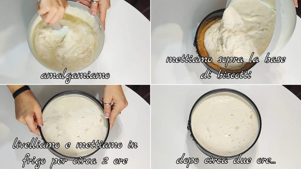 Mélangeons bien. Mettons le mélange obtenu sur la base, nivelons et mettons au frigo pendant au moins 2 heures. Après environ deux heures…