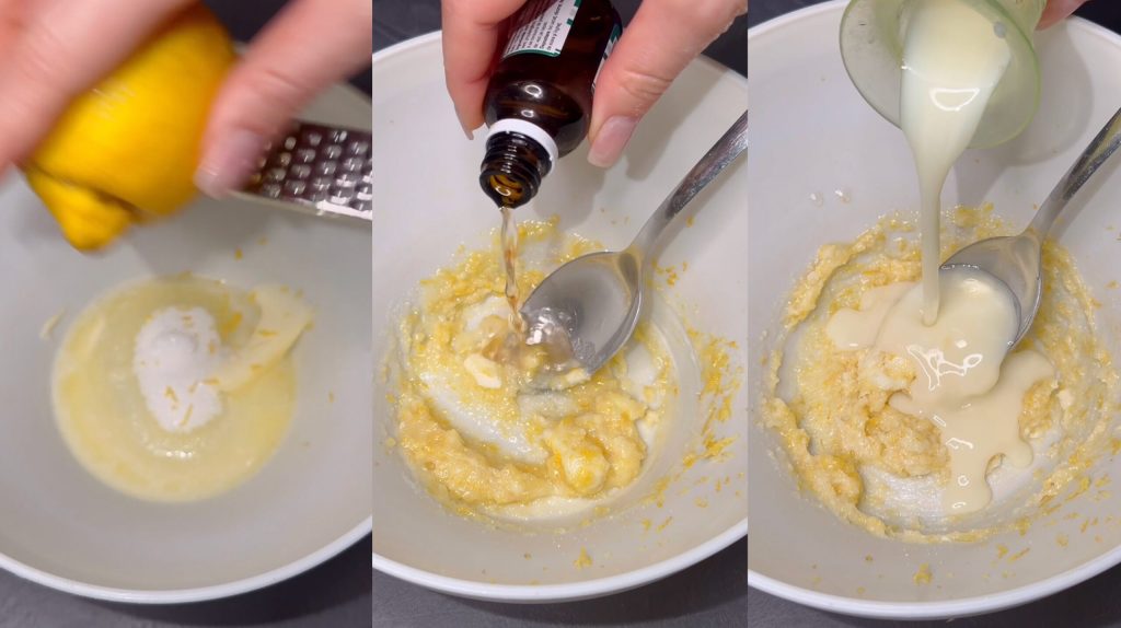 Dans un bol, mettez le beurre fondu, le sucre, le zeste de citron et l’arôme de vanille. Mélangez bien. Ajoutez le lait