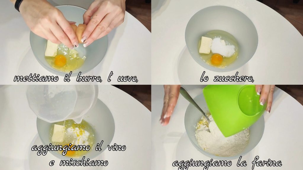 Dans un récipient, mettons le beurre, l’œuf, le sucre, le vin et mélangeons. Ajoutons la farine.