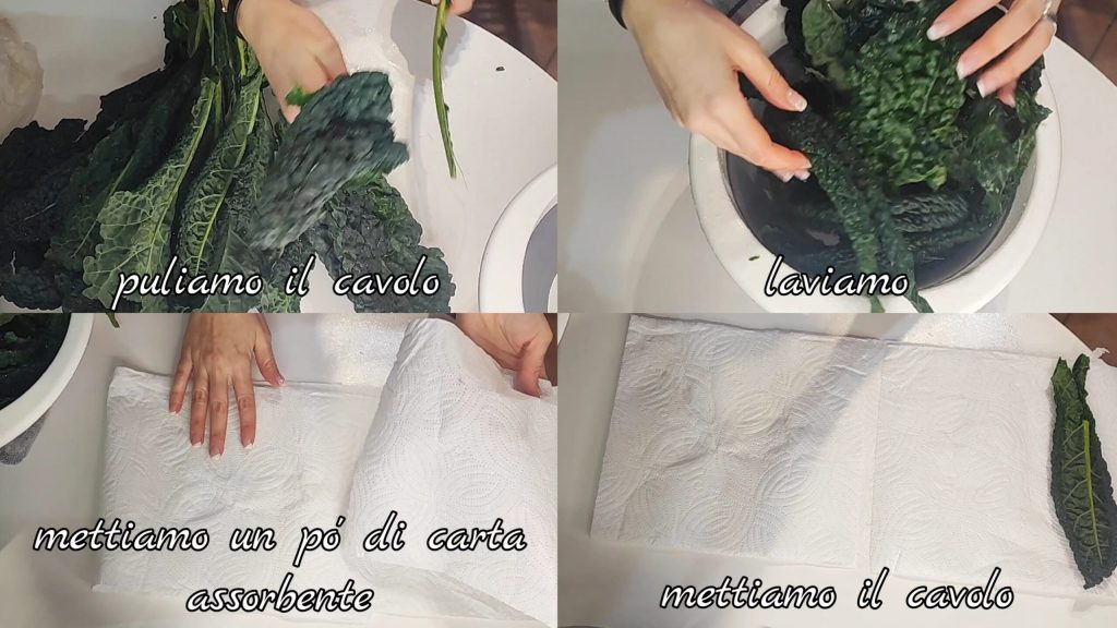 Tout d’abord, nous devons nettoyer le chou, prendre une feuille à la fois et enlever la nervure centrale dure, vous pouvez voir la vidéo avec la procédure complète ICI. Lavez bien les feuilles et laissez-les bien égoutter. Mettez un peu de papier absorbant (essuie-tout) et déposez les feuilles de chou dessus.