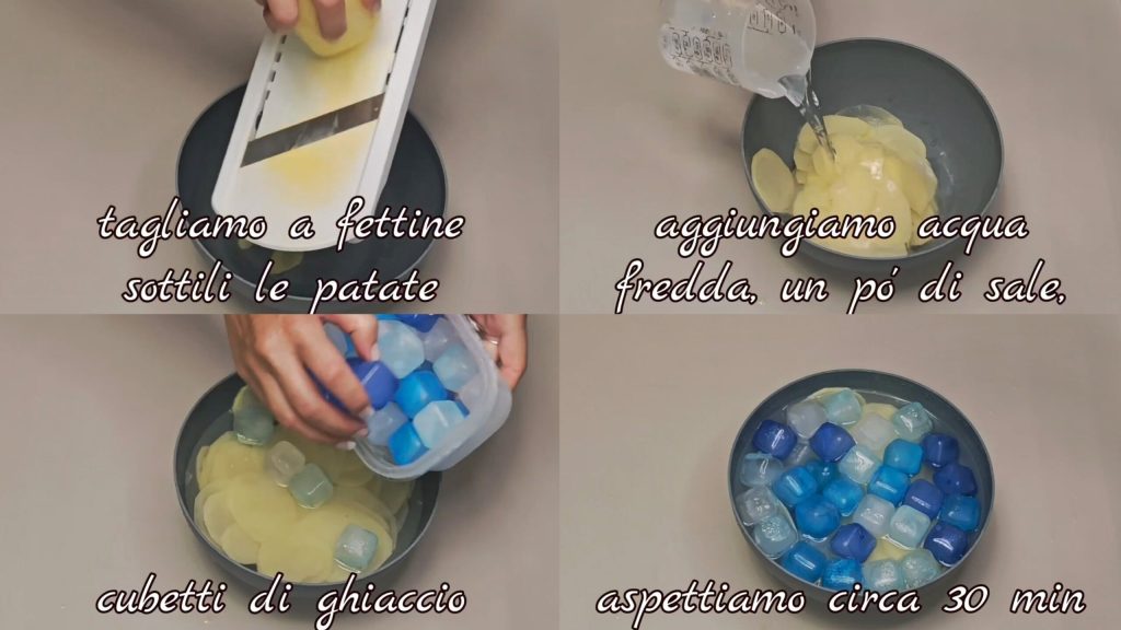 Tout d’abord, nettoyons, lavons et coupons les pommes de terre. Ajoutons de l’eau froide, un peu de sel, quelques glaçons et attendons environ 30 minutes.